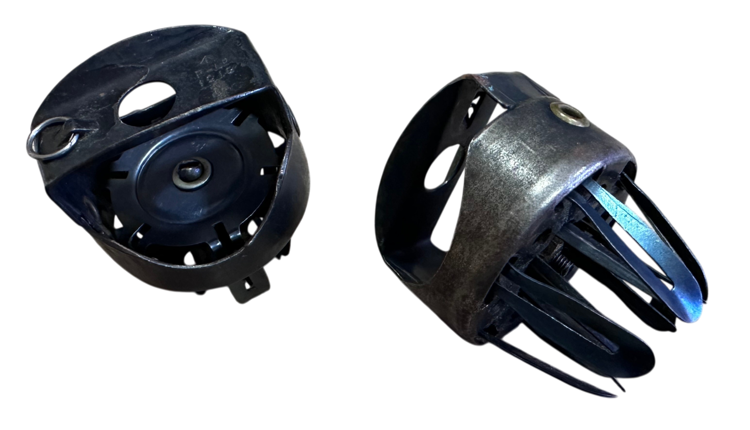 In 1893, one Mr. William de Courcy Prideaux, a subject of Queen Victoria, patented a device he referred to as a ‘cartridge-packet holder’. This device was a circular disc through which 12 spring-steel fingers protruded in six pairs. Each pair held one .455 caliber round for the British Webley style revolver. A later 1914 improved design added a bridge-like handle to the rear of the plate.